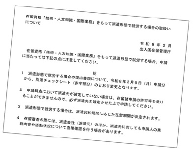 2026年3月9日から、在留資格「技術・人文知識・国際業務」をもって派遣形態で就労する場合の取扱いが変更になります。